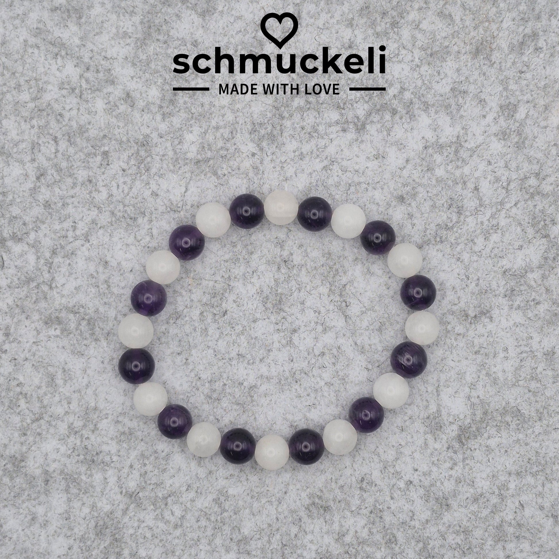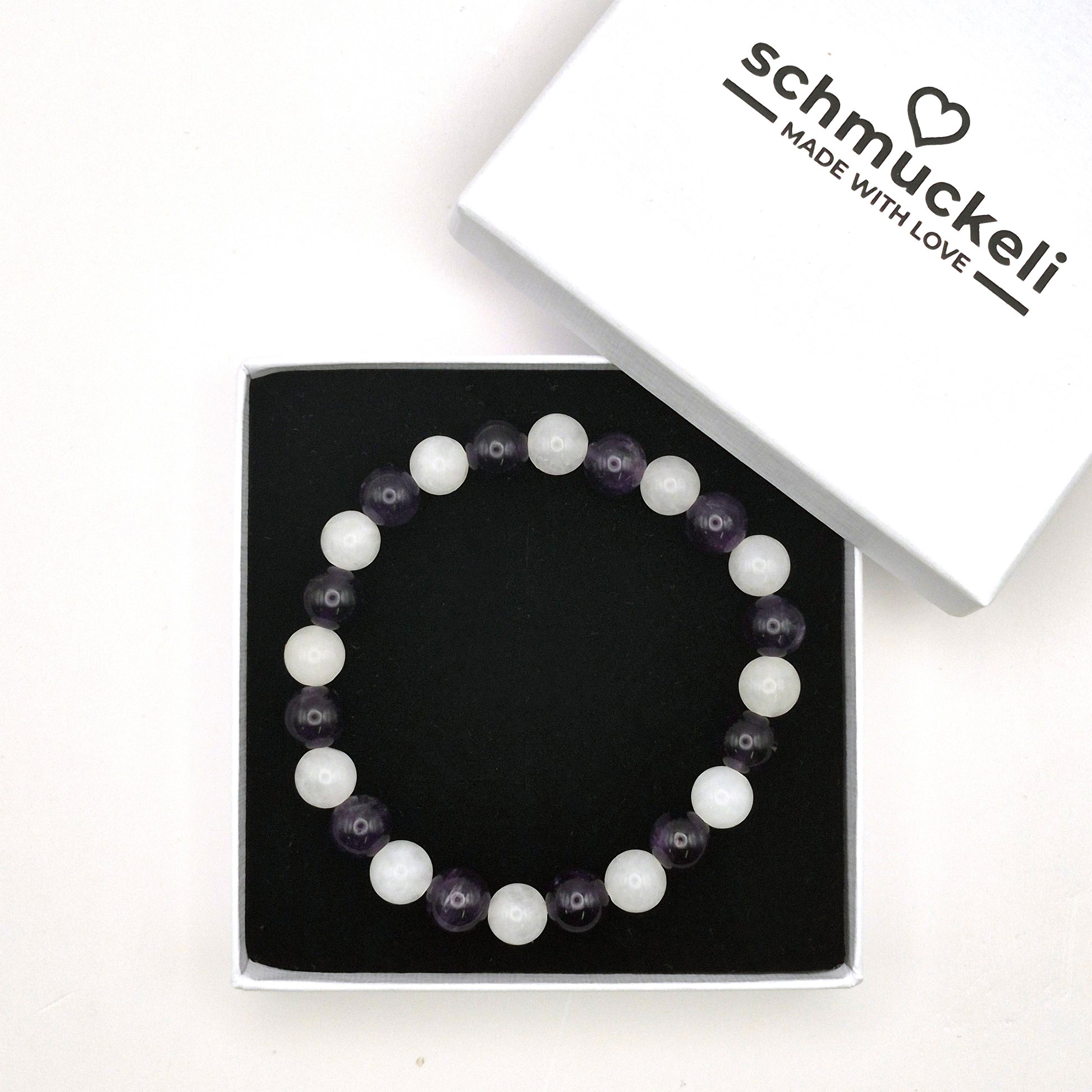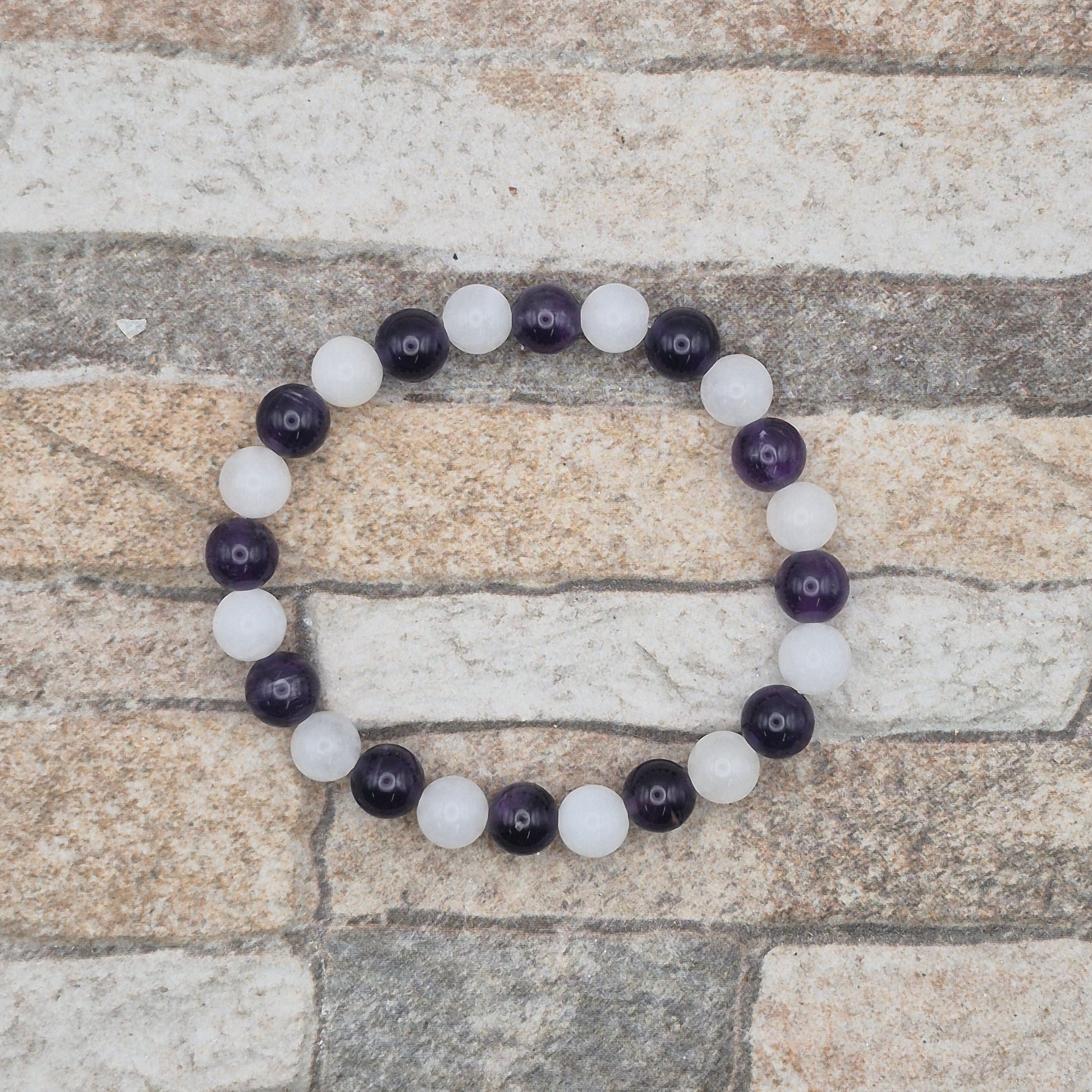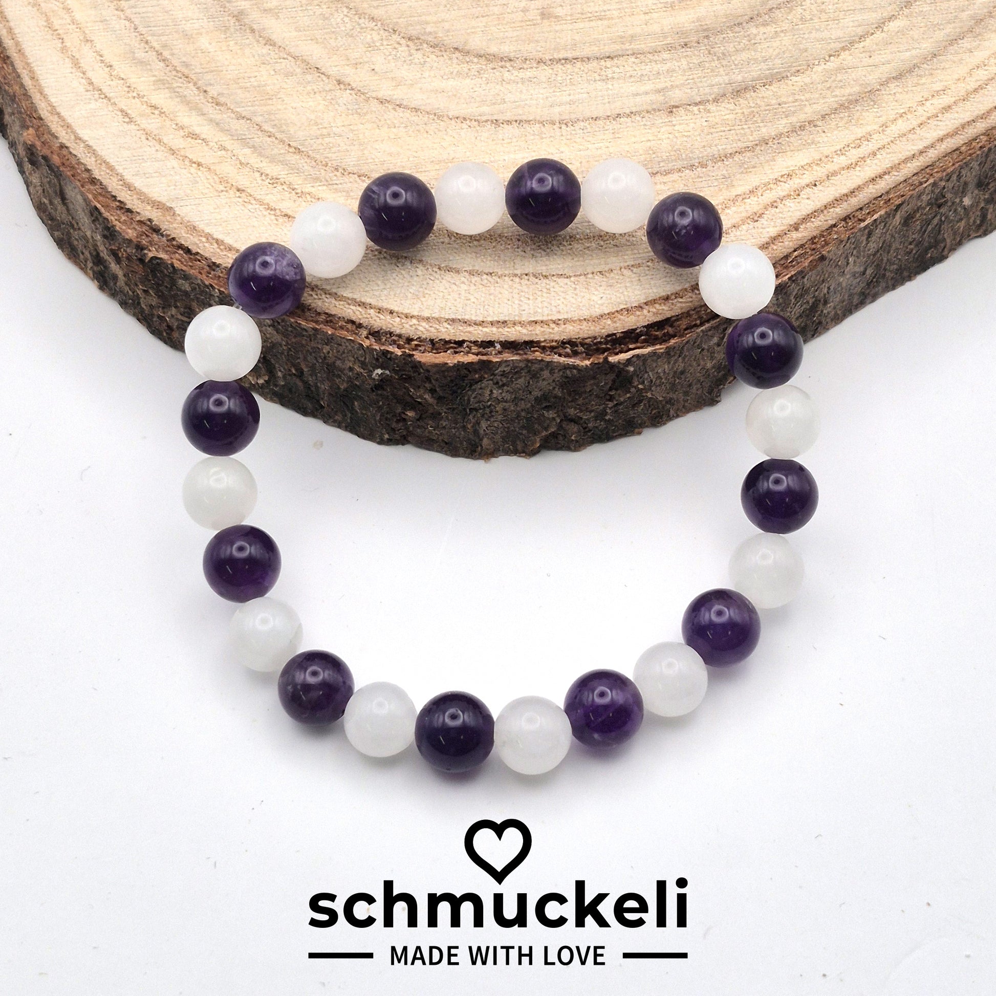 Hier verbinden sich Gegensätze zu einer harmonischen Einheit – die helle Klarheit der Jade mit der geheimnisvollen Tiefe des Amethyst. Dieses Zusammenspiel erinnert daran, dass wahre Balance nur im Einklang der Unterschiede entsteht. Das Armband vermittelt Stärke und Ruhe zugleich und unterstützt dich darin, in deiner Mitte zu bleiben. Jeder Blick darauf ist wie eine kleine Erinnerung an Ausgeglichenheit. Ein Schmuckstück, das Eleganz mit innerer Harmonie verbindet.