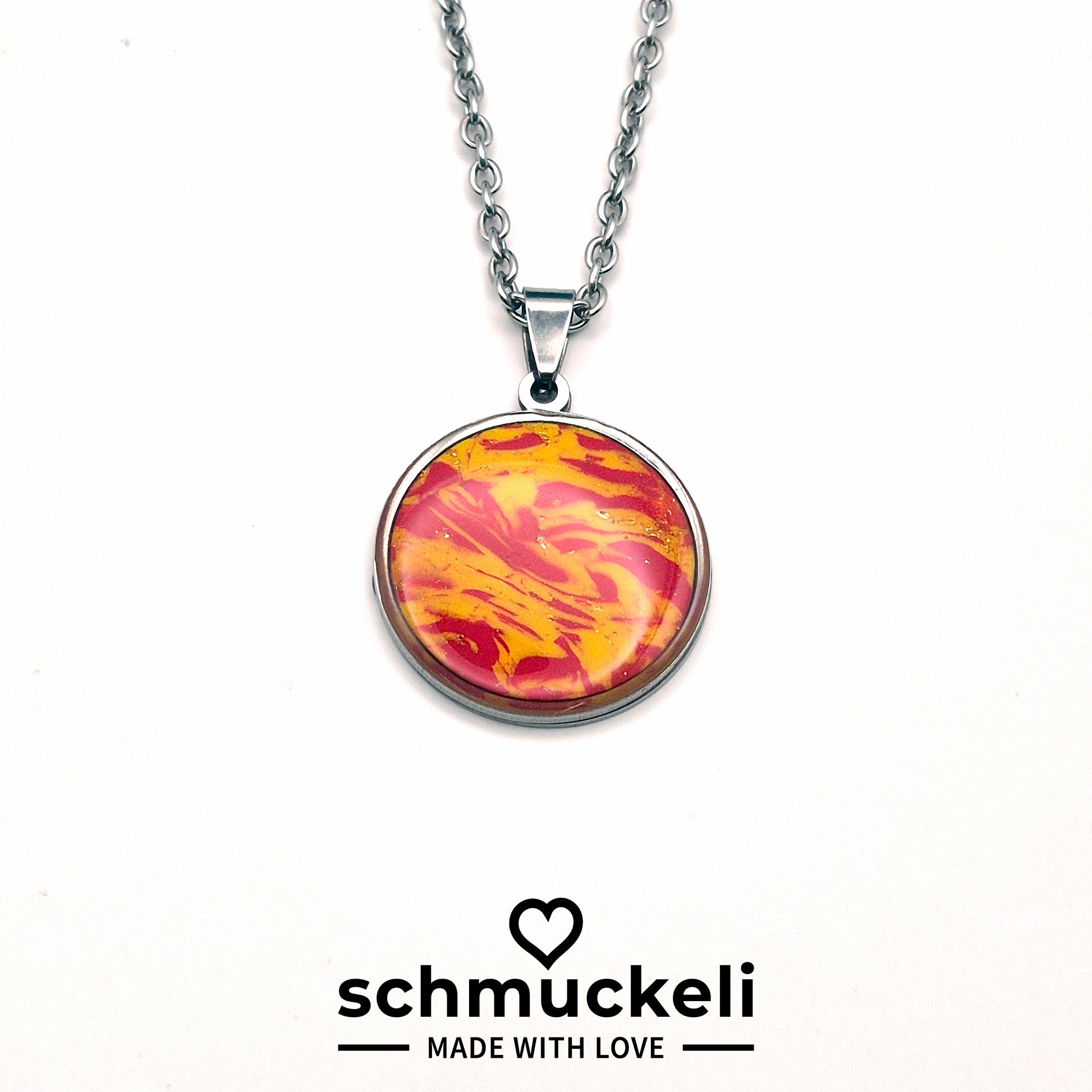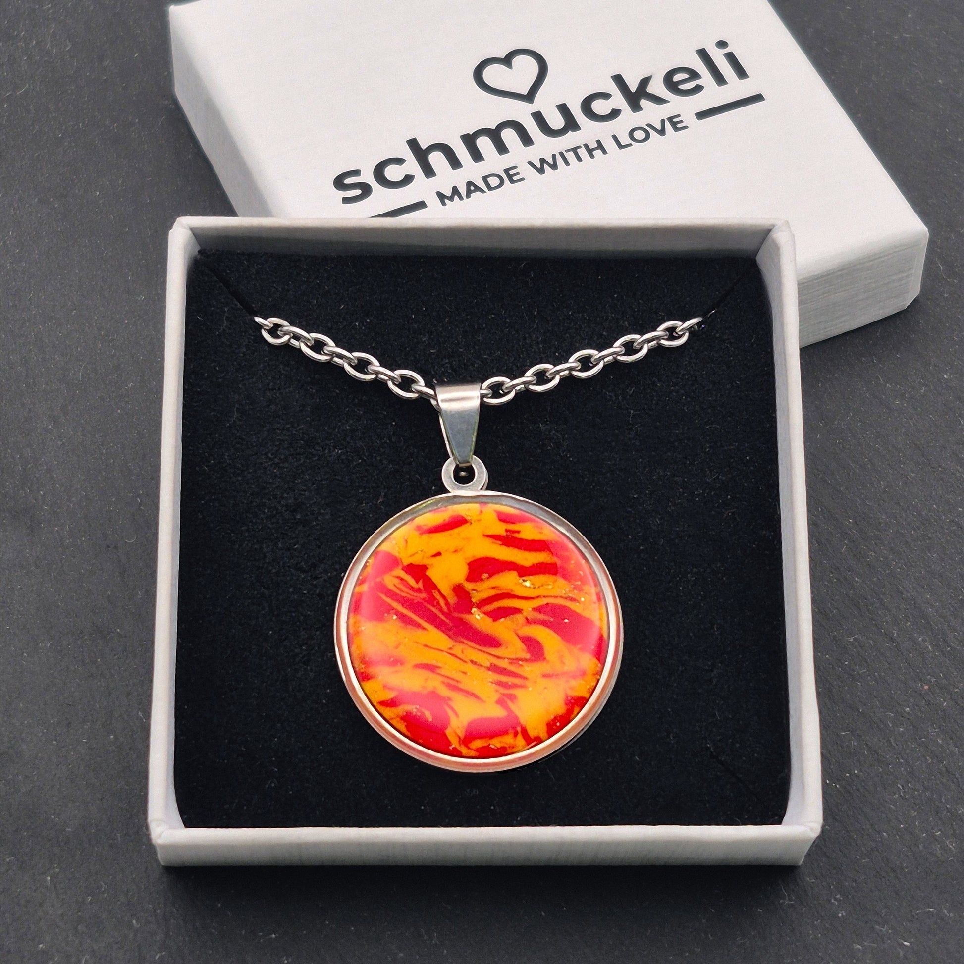 Runder Anhänger Feuerglanz – Handgemachter Unikat-Schmuck aus Edelstahl mit leuchtendem Polymer Clay Inlay, versiegelt mit glänzendem Harz - mit 45 cm langer Edelstahlkette