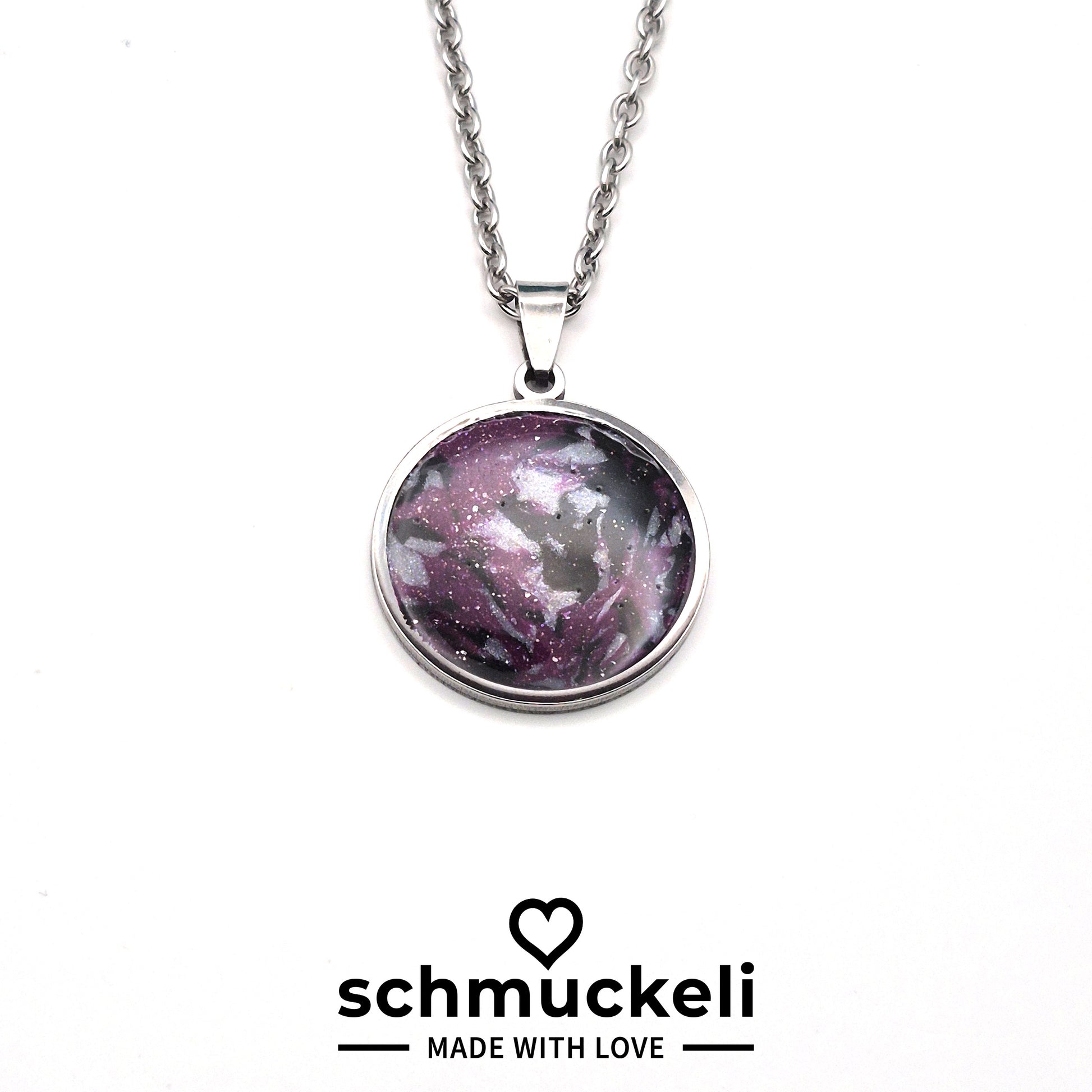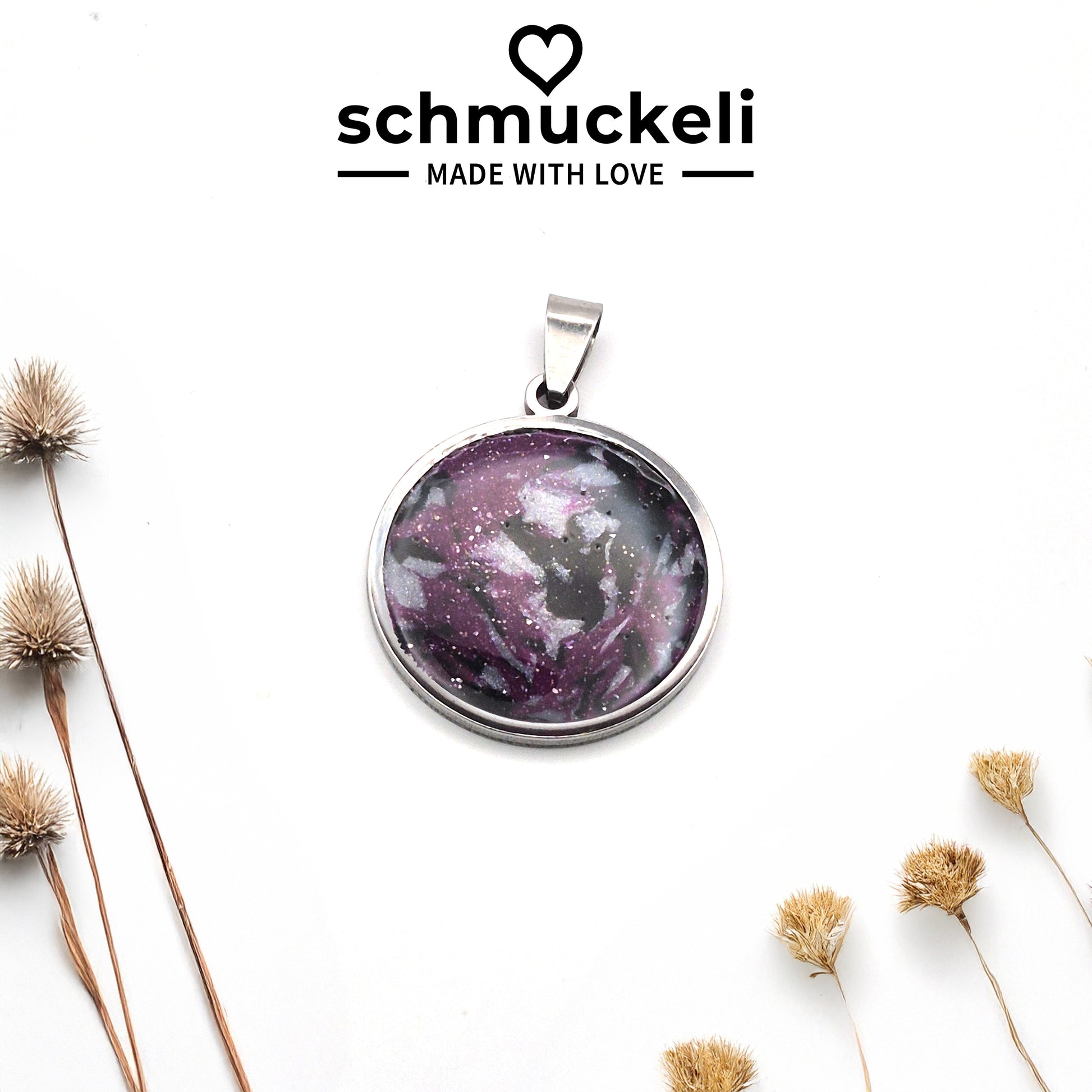 Tauche ein in die faszinierende Welt von „Galaxia“ – ein einzigartiger Anhänger, der mit viel Liebe zum Detail handgefertigt wurde. Im Inneren befindet sich eine kunstvoll gearbeitete Einlage aus Polymer Clay, die mit ihrer marmorierten Struktur in Violett-, Weiß- und Grautönen an eine ferne Galaxie erinnert. Jede Maserung ist ein Unikat, was jedes Stück zu einem kleinen Kunstwerk macht.