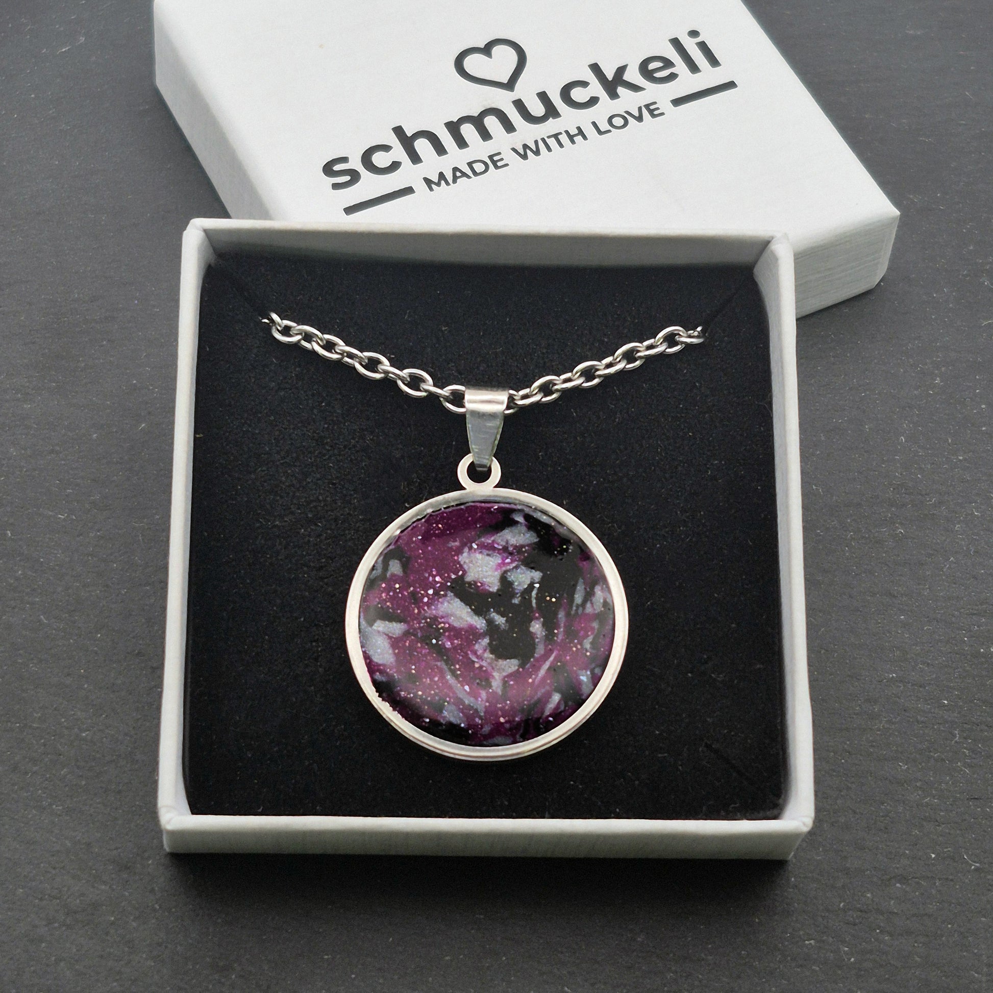 Runder Anhänger Galaxia – Handgefertigter Schmucktraum im Edelstahlrahmen, versiegelt mit glänzendem Harz - mit 45 cm langer Edelstahlkette