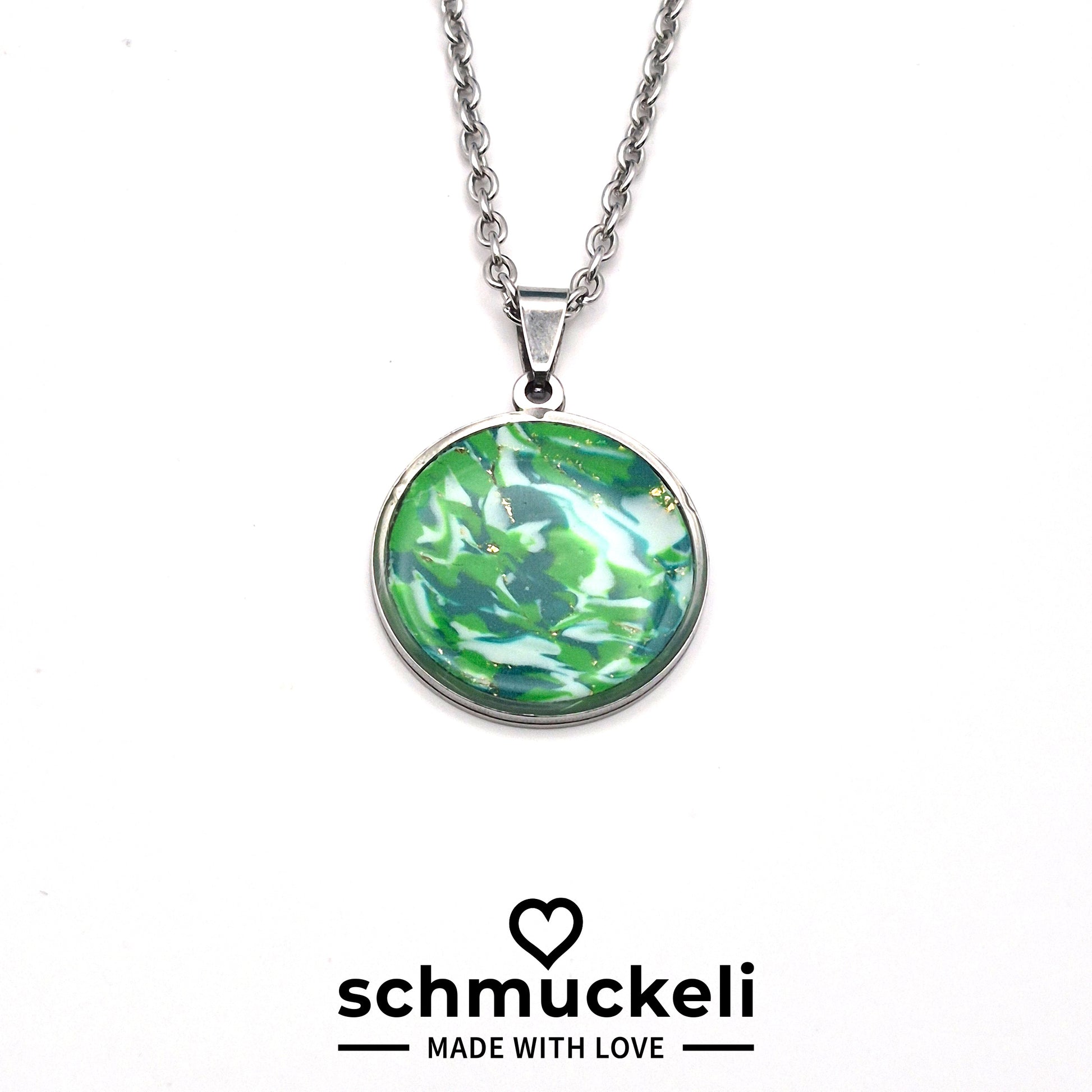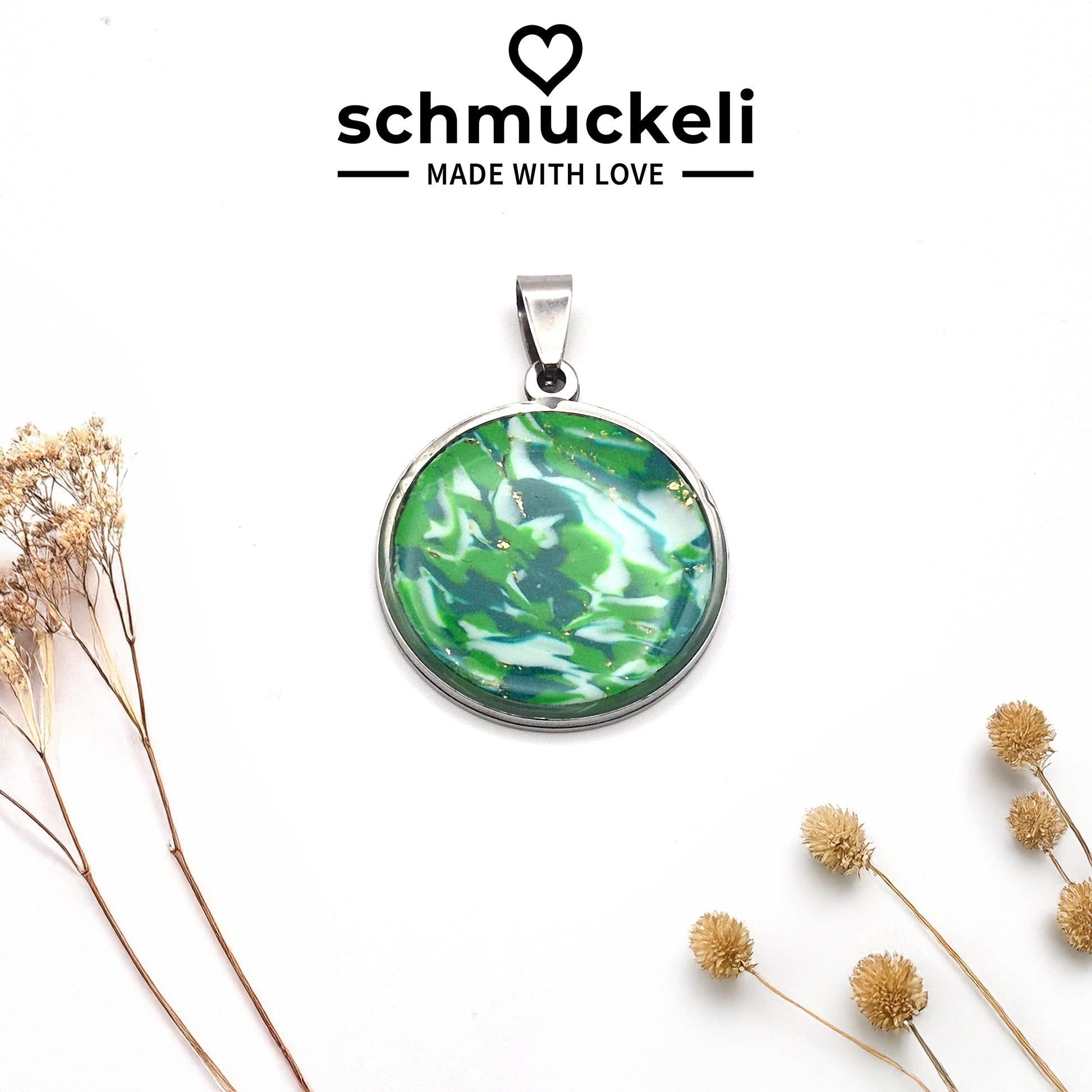 Runder Anhänger Waldglanz– Schmuckanhänger wie ein Tanz aus Licht und Blättern, handgefertigt aus Edelstahl & Polymer Clay - mit 45 cm langer Edelstahlkette