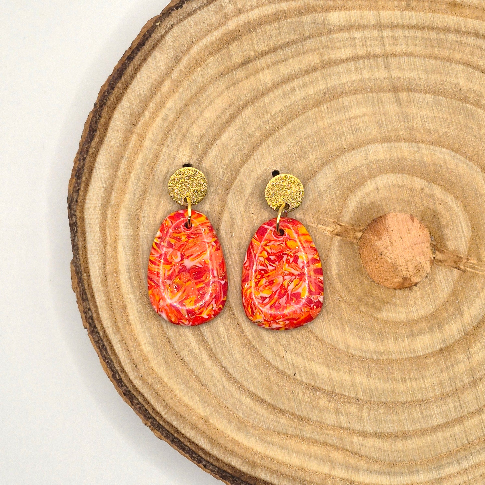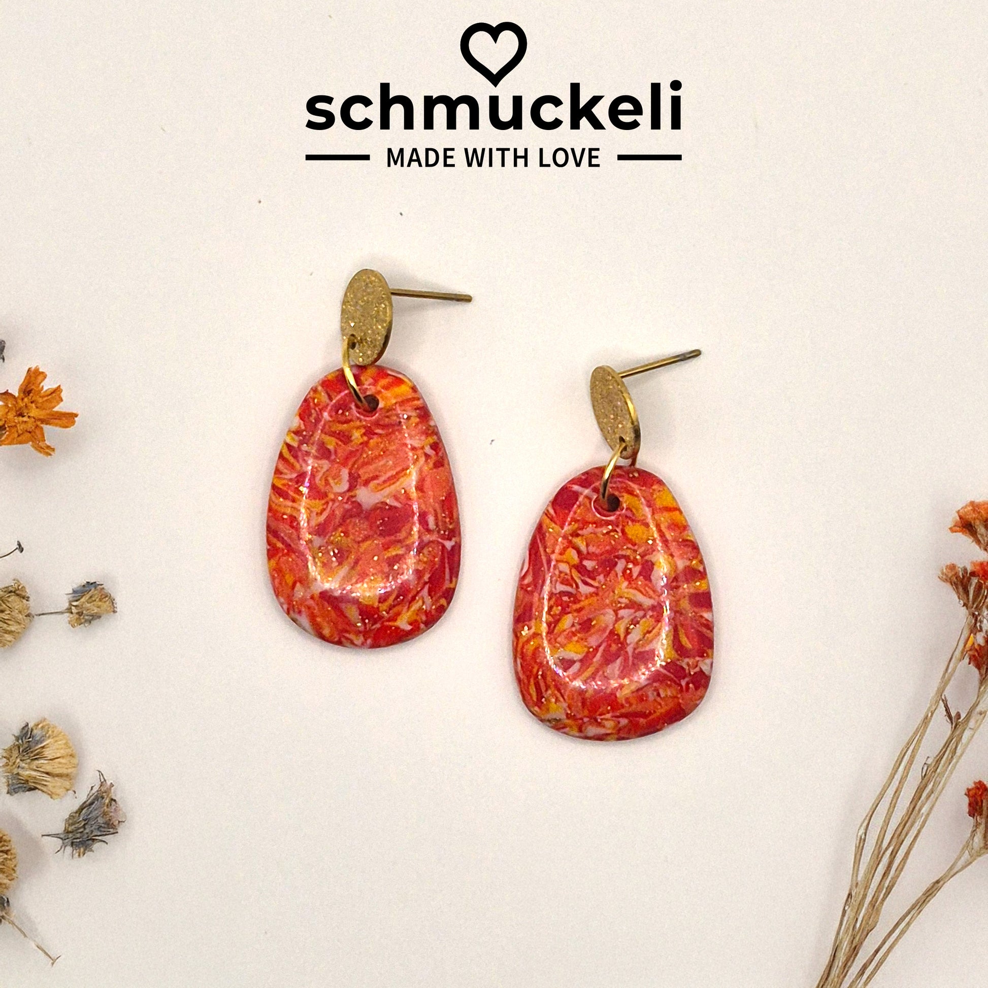 Bringe Farbe und Wärme in deinen Look mit unseren handgefertigten „Sonnenfunkeln“-Ohrringen. Jedes Paar wird mit viel Liebe aus hochwertigem Polymer Clay gefertigt und vereint kräftige Rottöne, goldene Akzente und ein einzigartiges, florales Muster. Die organische Tropfenform sorgt für eine moderne, dennoch natürliche Ausstrahlung. Ein echtes Statement-Piece – leicht, elegant und besonders.