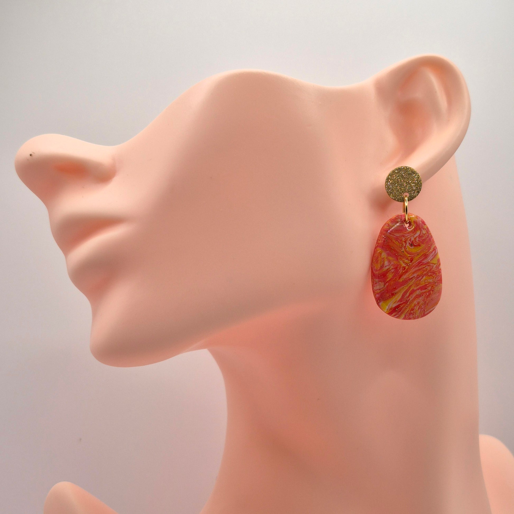 Diese einzigartigen Ohrringe aus Polymer Clay vereinen lebendige Rot-, Orange- und Goldtöne in einem marmorierten Muster, das an tanzende Sonnenstrahlen erinnert. Leicht, auffällig und ein echter Hingucker – perfekt für farbenfrohe Outfits oder als besonderes Highlight im Alltag.