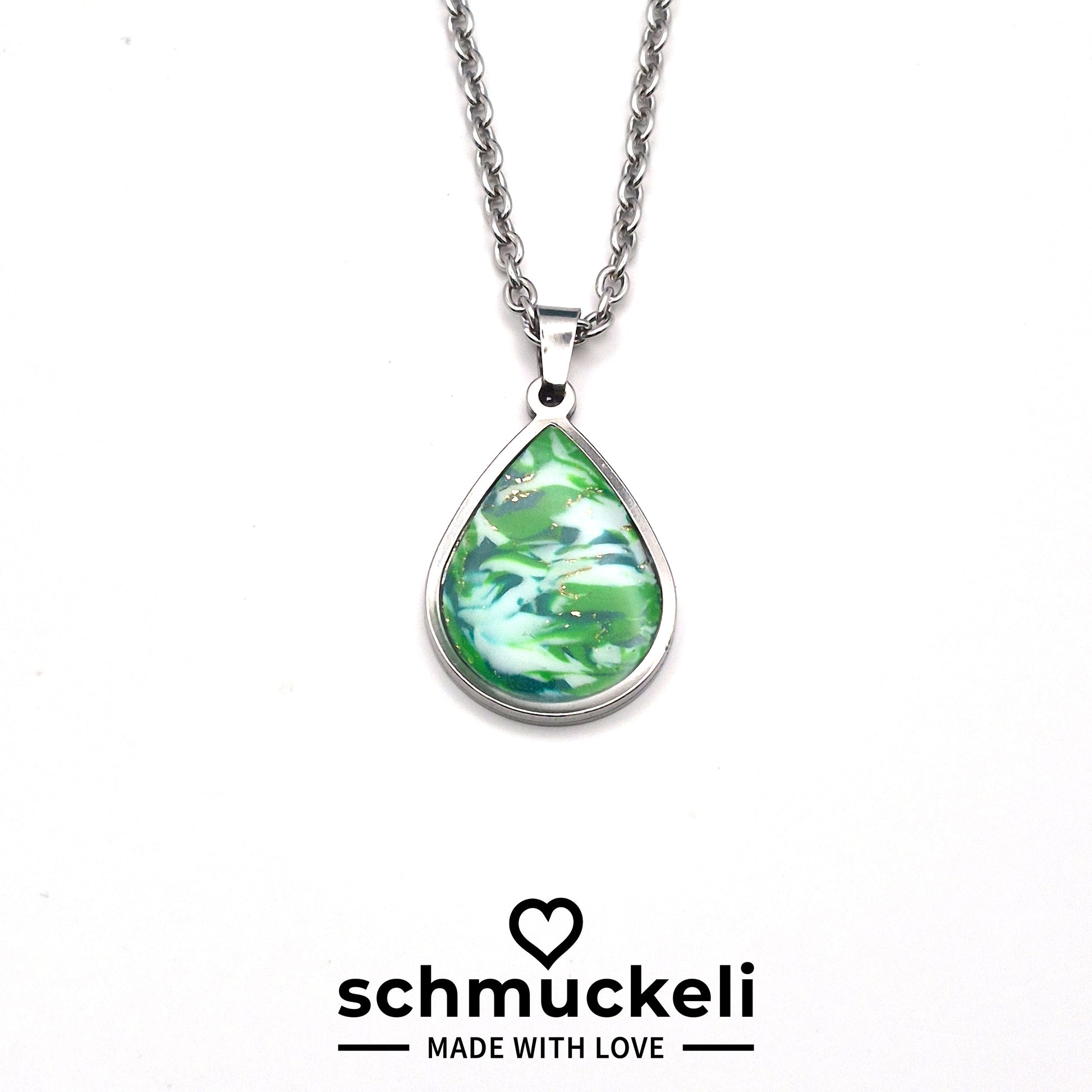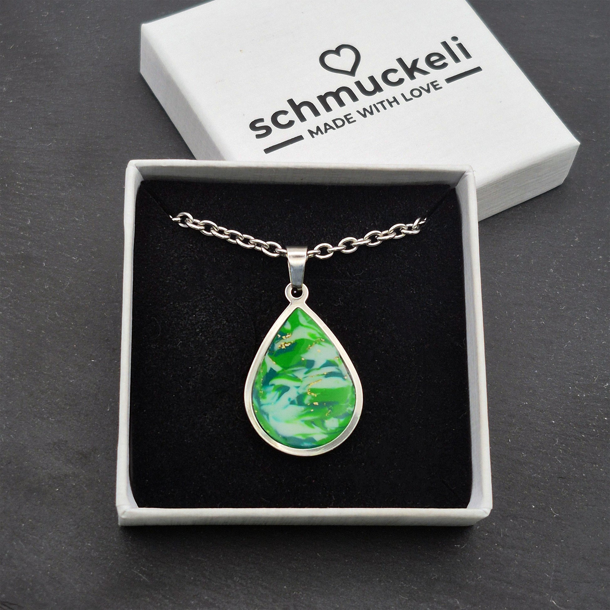 Tropfen Anhänger Waldglanz– Schmuckanhänger wie ein Tanz aus Licht und Blättern, handgefertigt aus Edelstahl & Polymer Clay - mit 45 cm langer Edelstahlkette